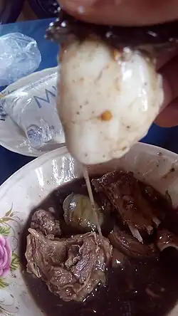 It is a soup made from the Okoho stick which is very slimy after preparation. It is usually prepared with bush meat (such as grass-cutter, alligator and smoked meat etc.) and best served with pounded yam (aka Onihi). It can also be eaten with semolina, eba (made from garri) and yam flour. This soup is usually prepared without the use of oil. It is the most respected and demanded food in all Idoma events such as; traditional weddings, burial ceremonies, birthdays and other festivities. Okoho soup is highly medicinal and also known for its ability to aid digestion.[2] Other Nigerian tribes such as Igbos and Igalas also refer to it as Okoho,[3] while the stick is known as Ajara or Orogbolo by the Yoruba tribes of northern and southern Nigeria. The Hausas usually call it Dafara.[1]