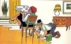 Oktaaf Keunink centers around an old pipe smoking office clerk[2] who is dominated by his bossy wife Beva. In some gags he has a temporary different job, but most of the time he works at his office. His home address was also specified in the series, namely Kladderpoelstraat 9 in the fictitious village Zwaaigem (a pun on Aaigem or Baaigem).[2] A running gag is Oktaaf's desperate attempt to play cards with his friends in his local bar, even though his wife repeatedly tries to keep him home.[2][1] He also has a rivalry with his neighbour, Balk, who looks a lot like Slager Janssenss from Sleen's other series Doris Dobbel (both characters were caricatures of Jan De Spot, a journalist who was one of Sleen's personal friends). Balk's wife also resembled another character by Sleen, namely Madam Nero, wife of Nero in The Adventures of Nero.[1]