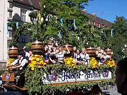 The procession is led by the Münchner Kindl, followed by members of the Munich city council, representatives of the Bavarian state government, musical and marching bands, traditional-costume and rifle clubs, flag-wavers, and about 40 decorated horse-drawn carriages. Most groups come from Bavaria, though delegations also arrive from other German states, Austria, Switzerland, Northern Italy, and other European regions.[33] The entry of the Wiesnwirte (festival innkeepers) and the costume and marksmen procession are organised by Festring München.[34]