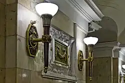Both the central and platform vaults are divided by arches which have large bas-reliefs which contain medallions of Soviet Army soldiers surrounded by ornaments. The pylons contain a bas-relief centred ventilation grilles which are flanked by two anodized aluminum torches that give the overall golden glow to the bright grey marble that faces them. The station walls are ceramic tiles and are decorated with relief images of gilded wreaths and stars. The end of a central hall contains a miniature triumphal arch with a metallic gate that walls of a blue lit room, symbolising the time of peaceful life. The floor of the station is laid with grey and red granite, and the perimeter of the central hall is also bordered out by a pattern of bright and dark marble.