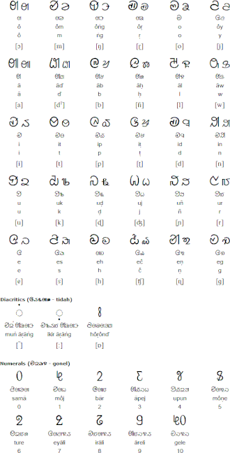 There are three additional signs (referred to as ṭiḍaḥ): the nasalisation sign mu (or mun arang [˜], a dot diacritic used above vowel letters), the lengthening sign ikir (or ikir arang [ː], a dot diacritic used only below the vowel letter a [ɔ], where it can occur simultaneously with the nasalisation sign mu), and hoddond (a special sign occurring only after the consonant letters ab [b] and uj [ʤ] to indicate glottalisation [ɒ]).