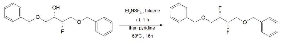 The Olah reagent is a nucleophilic fluorinating agent. It consists of a mixture of 70% hydrogen fluoride and 30% pyridine; alcohols react with this reagent to give alkyl fluorides:
