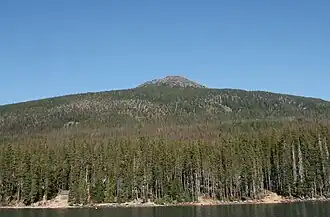 Olallie Butte is considered a shield volcano,[18] though it has a conical shape that serves as a transitional morphology between steep, mafic volcanoes like Mount McLoughlin and Mount Thielsen and flatter, mafic shields.[19] Made of basaltic andesite,[18] it has a mafic composition.[13] Nearby volcanic vents include the Sisi Butte, South Pinhead, and West Pinhead shield volcanoes and the Fort Butte, North Pinhead, and Potato Butte cinder cones.[18] Cinder cones in the area have gray-red cinders that have been oxidized, scoria, agglomerate, and small lava flows consisting of porphyritic basaltic andesite and black and yellow-brown to dark yellow-orange, palagonite basaltic andesite. The black and orange color of some of the eruptive material from these cones suggests that there was interaction of the lava with wet ground or snow, causing rapid chilling of the ejecta that prevented oxidation from taking place.[4] At Double Peaks and an unnamed hill southwest of View Lake, there are gray-pink to light brown-gray hornblende dacite lava domes.[4]