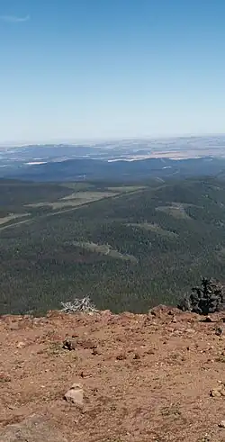 Olallie Butte is located within Jefferson, Marion, and Wasco counties, all within the northwestern to north-central part[4] of the U.S. state of Oregon.[2][5] The volcano lies just outside[6] the irregularly shaped Olallie Roadless Area, which lies within the Mount Hood National Forest to the west of the major crest of the Cascade Range and directly north of the Mount Jefferson Wilderness.[4] This region encompasses 13 square miles (34 km2) of an upland area with small volcanoes, bordered to the southwest by the canyon wall of the North Fork of the Breitenbush River. It can be accessed from trails running from the Clackamas and Breitenbush River drainages, which reach the eastern and southern parts of the Olallie Area, as well as logging roads that enter the Olallie roadless area at its northern portion.[4]