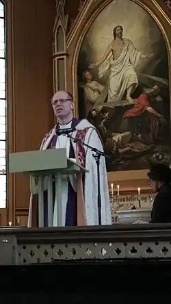 In the preliminary/advisory poll, Øygard and Finnset were leading in votes, but Øygard won the first round of voting at the Church Council elections.[4] In the final round of voting on 25 September 2014, between the top two candidates, Øygard received eight votes, and Finnset received seven.[2][4][5] He became the third bishop created in the Church of Norway since the power to appoint bishops was transferred from the King to the Church Council.[5] Øygard's election was announced at a press conference later that day, hosted by Church Council president Svein Arne Lindo.[2][3][4][5] Introducing Øygard, Lindø said:
