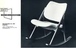 The 'Fabian Rocking' is essentially a '46' lounge chair mounted on either mahogany or beech runners. The Fabian’s frame was made of either mahogany or beech wood and originally upholstered in sheepskin or various wool mixes. The Fabian chair was made in few examples and is extremely rare.