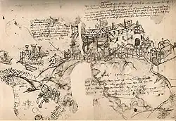 Älvsborg Castle is first mentioned in written sources during the reign of King Albert (1364-89), but seems to have been built slightly earlier, most likely during the reign of his predecessor Magnus Eriksson.[2] Magnus certainly seems to have been responsible for the construction of another castle in the area, at Lindholmen on the opposite bank of the river. Indeed, Älvsborg may have been intended to replace Lindholmen, as the latter fortress fell out of use shortly after the construction of Älvsborg.[3][4]