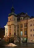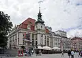 The first wooden city hall in Legnica was established as early as the 14th century on the basis of a privilege granted by Duke Boleslaw III the Wasteful.[1] Similarly to the subsequent brick building, the wooden structure was subject to fire damage.[1] The present building was erected between 1737-1741 under the direction of Franz Michael Sheerhofer, as a fragment of the market square complex.[2] The first meeting of the city council took place on May 15, 1741, and the last - 164 years later - on April 8, 1905.[3] The building was reconstructed in 1836, and then rebuilt again between 1926 and 1928, as a theater.[2] It was renovated in 1960-1960, and most recently in 1977-1978.[2]