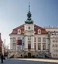 The Baroque building has three tracts, a large hallway and three storeys.[2] There is a risalit on the axis of the building, emphasized by two separate rows of external stairs.[2] The rusticated first floor supports the pilasters dividing the elevation.[2] The building is covered with a mansard roof with dormers, and the risalit with an onion helmet.[2] The Old City Hall is now integrally connected to the adjacent theater on the north side.[3] It is occupied by the administration of the Helena Modrzejewska Theatre in Legnica and the actors' dressing rooms.[3]