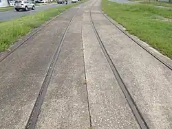The tramway tracks are standard gauge, with a width of 1,435 millimetres, and are laid using 80-pound rails (except on curves). The curves near Orwell and Wonersh Streets are a heavier grooved, or guarded rail.[1]