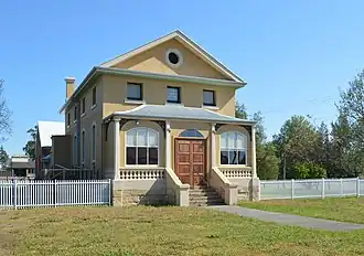 Built as a courthouse in c. 1882, when the original building ceased operating as a courthouse, it fell into disrepair and was even used at one point to store pesticides for the Prickly Pear Authority. In 2014, the Old Court House received new roof sheeting, gutters, eaves, render, internal and external painting and a disabled ramp through a $127,000 grant from Heritage NSW, $137,000 funding from the Upper Hunter Shire Council and a $10,000 donation from the Hunter Mutual Regional Bank. The building now serves as a multi-purpose function centre for lectures, plays, functions and debates.[2]