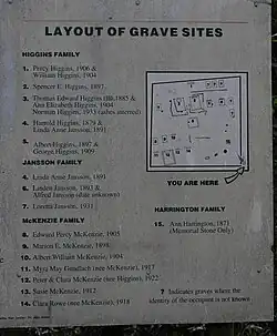 The earliest graves in the cemetery were arranged in east-facing rows, a traditional orientation. As the number of burials in the cemetery increased during the early 20th century, it seems that a number of conscious decisions were made regarding planning and layout. The cemetery gradually became more formalised with distinct groupings of graves for each branch of the family. The McKenzie family plots occupied the southeast corner, the Jansson family plots occupied the northwest corner, the Higgins' family plots occupied the centre and western area and the unmarked infants' graves were placed along the eastern boundary towards the northeast corner.[1]