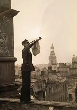 - The old town weighing house (Waga Miejska), behind the Town Hall, facing north. This was first built 1532–1534, reconstructed 1563, demolished as unsafe in 1890 (replaced by a Renaissance-style "New Town Hall" used by the city government, heavily damaged in 1945), rebuilt in its former style in 1950–1960 based on surviving prints, renovated in 2002, now used for weddings and other functions.
