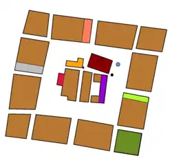 The central group of buildings includes:
