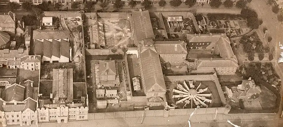 An allotment of scrubland to the north-east of Melbourne was selected as Port Phillips first permanent gaol. On 1 January 1838, George Wintle was appointed to be gaoler at the prison at £100 a year; with the site becoming colloquially known as Wintle's Hotel.[2] Construction of the gaol started in 1839–1840 on Collins Street West, but it was considered too small at the time. A second gaol was then built between 1841 and 1844 at the corner of Russell and La Trobe Streets, adjoining the then Supreme Court.[3] The first cell block was opened for prisoners in 1845, but the facilities were considered inadequate; escapes occurring frequently. The gaol was already crowded by 1850.[4]
