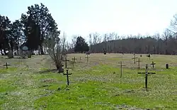 Easily mined surface deposits of lead were depleted by the mid-19th century,[20] though the state geologist reported small-scale surface mining and refining around Old Mines in 1867.[21] When lead production escalated after the Civil War with capital-intensive deeprock mining techniques, it did so in new areas east of Potosi and Mine a Breton, drawing economic activity even further away from Old Mines. In 1874 mining for "tiff", as barite is called locally, began to replace lead digging in the Old Mines region. It could be extracted manually from near-surface deposits in small operations much as lead had been for generations. This provided the enclave the means to continue supporting itself while maintaining its own way of life after the lead had been mined out.[22] Men would dig tiff a couple days each week to support their families, with additional sustenance coming from home gardens.[4] Eventually the wagon road that Moses Austin had built to haul ore to Herculaneum, which passed through Old Mines, was replaced by a railroad which did not, and the area's isolation became deeper.[21]