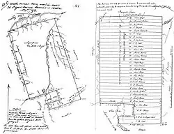 The concession straddled Old Mines Creek, and in the rush to get the land surveyed and titled before the Americans took over following the Louisiana Purchase, it was laid out into 31 long, narrow plots with a length equal to the full width of the concession. Ownership to individual plots was assigned through a lottery that had no relationship to where individuals had their cabins or worked mines. The mines worked in common at the south end were held out of the subdivision, but there was no accommodation for a usual French village with streets, clustered homes, and a commons.[17] Most of the French ignored the assignment of ownership and continued to live where they had, mostly in the village of Old Mines near the south of the concession, and at Racola near the center. Most had sold their lottery-assigned land within a year to outside speculators.[18]