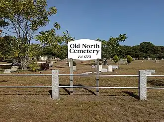 The Old North Cemetery is the oldest cemetery in Truro, Massachusetts. The cemetery, formerly the Old North Graveyard, was established in 1713 on the Hill of Storms where the first church in Truro was built in 1709. It remained the town's only cemetery until 1799 when the Pine Grove Cemetery was established. Old North is on US Route 6 between Aldrich Road and South Highland Road. Many individuals associated with Truro's early development are buried here, as are ship's captains. When originally laid out, the cemetery was about 3 acres (1.2 ha) in size; it was expanded in 1926 and again in 1974 and is now 5.8 acres. The oldest part of the cemetery is its northernmost section, abutting Aldrich Road.[2] As of 2022 there are approximately 1,670 burials in the cemetery. Over half of those buried in the original "Old Stone" (north) section were less than 50 years old when they died.
