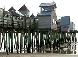 Three versions of the Pier were constructed by people and modified by nature. The first, 1,770 feet (540 m) long, was built of steel in 1898. When the ribbon was cut on July 2, 1898, it was a “global cultural icon,” at 1,825 feet the longest steel pier in the world, created by Berlin Iron Bridge Co. at a cost of $38,000.[17] At its end was the Pier Casino, a ballroom with room for 5,000 dancers. Shortly after its completion a storm reduced its length by 150 feet (46 m). It was rebuilt, but 10 years later, after another storm, the pier was shortened to 700 feet (210 m) and the Casino was moved. In the interwar period, the Casino hosted such acts as Guy Lombardo, Louis Armstrong, Benny Goodman, Xavier Cugat and Frank Sinatra. After the war Old Orchard became somewhat downscale, becoming known as a destination for blue-collar partygoers. A fire in 1969 destroyed Noah's Ark, the two carousels, the Whale's Mouth, the Mine Ride, and the Jack and Jill slide. The Casino was demolished in 1970.[18] The current incarnation of the pier was built in 1980 after being destroyed by a blizzard in 1978.[11] The current structure stretches 500 feet (150 m) into the Atlantic Ocean. The wooden walk way is lined with souvenir shops, carnival-style foods, and a night club at the end of the pier.