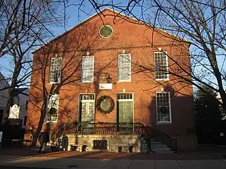 The meeting house was originally built in 1775 in the Early Republic style, but was largely destroyed by fire in 1835. It was rebuilt in 1836, and a bell tower was added in 1843 and granite entrance stairs were installed in 1853. The campus was added to the National Register of Historic Places in 2001.[3][4] The church also lies within the bounds of the Alexandria Historic District.