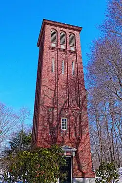 Also in the grounds, situated close to the church, is the Hingham Memorial Bell Tower, erected in 1912 to commemorate the 275th anniversary of the founding of Hingham, and in memory of the town's founders. The tower contains ten bells hung for change ringing, also made in 1912 by Mears & Stainbank, of Whitechapel, London.[20] The bells were cast specifically in order to be similar to the bells hung in St Andrew's Church in Hingham, Norfolk, which the town's founders would have heard while living in England, and are tuned to the same key of E.[21]