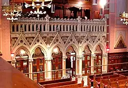 Centered above the Sanctuary on the east side of the church is a copper clad cupola surrounded by twelve ornate gothic arched windows. This feature is reminiscent of the cupolas of the Basilica of St. Mark in Venice. While the lantern provides a striking visual presence, it was also built with function in mind. In the days before mechanical fans and air conditioning, a series of mechanically operated louvers allowed for window panels to be opened to help cool the sanctuary inside.