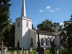 The church is surrounded by a pioneer cemetery with many notable grave sites both nationally recognized and locally significant. The oldest grave site is that of Daniel Rapelje’s son George in 1819;[9] the newest are modern. Nationally significant sites include that of Judge Hugh Richardson, who in 1885 sentenced Louis Riel to death. Locally significant folklore tells of the story of the "witch’s grave" (in fact, the grave of a woman named Maria Baldwin, who died in 1863, and who was not in life accused of witchcraft),[10] the Irish family curse of the Chisholm family where 7 family members died within 7 years,[11] and that of Canadian soldier Octavius Wallace, who fought in the American Civil War as a corporal of the 2nd Michigan Volunteer Infantry, and died at the Battle of Williamsburg in 1862.[12][13]