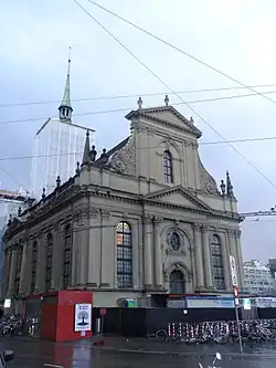 The Holy Ghost Church (German: Heiliggeistkirche) is a Swiss Reformed Church at Spitalgasse 44. It is one of largest Swiss Reformed churches in Switzerland. The first church was a chapel built for the Holy Ghost hospital and abbey. The chapel, hospital and abbey were first mentioned in 1228 and at the time sat about 150 meters (490 ft) outside the western gate of the first city wall. This building was replaced by the second church between 1482 and 1496. In 1528 the church was secularized by the reformers and the last two monks at the Abbey were driven out of Bern.[33] During the following years it was used as a granary. In 1604 it was again used for religious services, as the hospital church for the Oberer Spital. The second church was demolished in 1726 to make way for a new church building, which was built in 1726–29 by Niklaus Schiltknecht.[34]