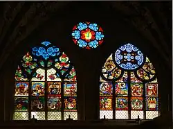 The stained-glass windows date from 1441–1450 and are considered the most valuable in Switzerland.[15] The windows include a number of heraldic symbols and religious images as well as an entire "Dance of Death" window. This window shows death, as a skeleton, claiming people from all professions and social classes. A "Dance of Death" was intended as a reminder that death would come to everyone regardless of wealth or status and may have been a comfort in a world filled with plagues and wars.