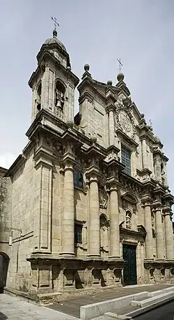 In the 16th century, the economic power of the Seamen's Guild led to the construction of the Basilica of Saint Mary Major. Throughout the 16th century, the network of streets, squares and buildings covered part of the empty spaces inside the walls of Pontevedra. In 1719, the English invasion caused great damage to the city.[14] During this century, urban renovations were carried out with new squares and streets and new religious buildings were built, such as the Church of Saint Bartholomew and the College of the Society of Jesus, as well as new urban palaces such as that of Mugartegui and the remodelling of that of the Counts of Maceda. Near the walled enclosure, the Church of the Pilgrim Virgin was built in 1792.