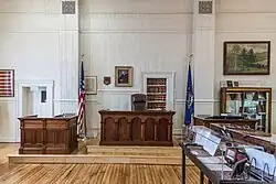 In 1959 county voters approved a bond issue for a new county government complex in Queensbury, along Route 9 several miles south of the village. It was built and opened in 1963, at which time the old courthouse was finally abandoned. It was vacant for several years, and considered for demolition until the newly formed Lake George Historical Association was able to persuade the Town of Lake George, which owned it by then, to reopen it for use as the association's offices and museum.[4] Shortly afterwards, in 1969, the 1885 front addition was torn down to restore the original view of the front of the building. In 1977, the Lake George Arts Center joined the historical society, opening a gallery in the former courtroom in addition to using the building as its headquarters as well.[5]