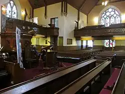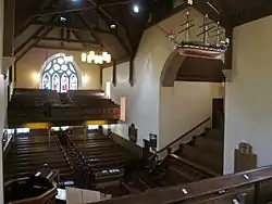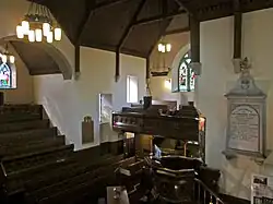 Proposals to restore the old kirk were at first "laughed at as a Utopian idea", but subscriptions were raised and extensive restoration work was carried out in 1864 under the supervision of the architect James Salmon. The interior was gutted, and the old earthen floor dug out to lay an asphalt damp-proof layer: over 70 copper coins and two silver coins were found, the earliest from 1634; a silver shilling was dated 1824.[32] The exterior walls were rebuilt in places and faced ashlar, and a church tower designed by Salmon was built at this time, incorporated stairs serving the Cartsburn Loft and the Farmer's Loft in place of the old external stairs. The walls were lined with lath and plaster painted a warm cream colour, and dark stained timber linings to the roof formed the ceiling. The church re-opened on Christmas Day, 1864.[33]
