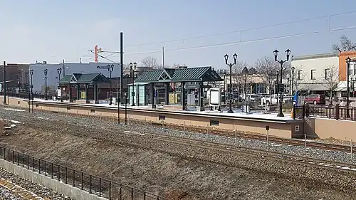 Olde Town Arvada station is a commuter rail station on the G Line of the Denver RTD system in Denver, Colorado. It is located in downtown Arvada, Colorado and is the fifth stop from Denver Union Station.[5] The station includes 600 parking spaces in a parking garage that is shared with local businesses.[6] Construction on the station and garage began late 2014.[7]