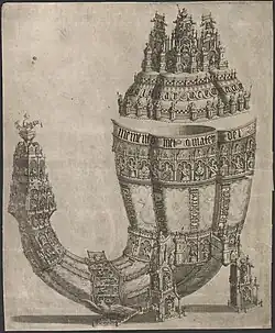 In the 13th and 14th centuries, drinking horns were treasured objects and prized heirlooms among the elite. It was not uncommon for them to be regularly recycled inside close families and kin-groups. The Oldenburg Horn stands out from these earlier drinking horns, being the first such horn in Denmark not made from a bovine horn.[1] It was made for Christian I of Denmark by an unknown silversmith in around 1465. It is believed that he intended to use it as a gift to the Three Kings in Cologne Cathedral on his journey to Rome in 1474–1475. Some sources state that he brought it back with him.[2][1][3] In 1690, it was transferred from Oldenburg to Copenhagen by Christian V for inclusion in the Royal Collections at Rosenborg Castle. In 1939, Rosenborg Castle was opened to the public.[3]