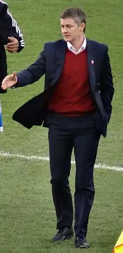On 9 November 2010, Solskjær signed a four-year contract with the Norwegian club Molde to take over as manager, where he played prior to moving to Manchester United.[142] Solskjær continued as Manchester United Reserves manager until January 2011, when he took over at Molde for the start of the new season.[143] On 18 March 2011, Molde played their first league game under Solskjær and suffered an embarrassing 3–0 defeat to newly promoted Sarpsborg 08. They played their first home game of the season on 3 April, where despite coming from 1–0 down to lead 2–1 they were held to a 2–2 draw by league leaders Tromsø. Molde's first goal under Solskjær was scored in this game, by Senegalese striker Pape Paté Diouf. On 17 April 2011, Solskjær won his first Tippeligaen game at Molde with the 3–2 home win over Stabæk. On Molde's 100 years anniversary on 19 June 2011, Solskjær led the team to a 2–0 victory over Sogndal and the top of the Tippeligaen. On 30 October 2011, Solskjær won the Tippeligaen with Molde in his first year as manager for the team.[144] On 18 May 2012, Molde gave Aston Villa permission to discuss their vacant managerial role with Solskjær, following the sacking of Alex McLeish.[145] However, Solskjær decided to remain with Molde to avoid disrupting his family after they had settled back in Norway.[146] On 11 November 2012, Solskjær's team, Molde, won the Tippeligaen for the second consecutive year after they beat Hønefoss 1–0, whilst their closest title challengers, Strømsgodset lost 2–1 away to Sandnes Ulf.[147] In 2013, Molde suffered a tough season opening with only 7 points in the first 11 matches. Under the guidance of Solskjær, Molde managed to recover and at the end of the season the team finished in sixth place with 44 points in 30 matches. On 24 November 2013, Molde beat Rosenborg 4–2 in the 2013 Norwegian Football Cup final to win the Norwegian Football Cup for the third time in the club's history, thus securing a place in the 2014–15 Europa League qualifiers.[148][149]