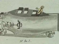 In 1808, Winstrup started to build a model of a propeller-driven submarine that he named ‘Hvalfisken (The Whale)’. It was about ten metres long and could move up and down using propellers connected to axles and cogwheels.