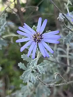 Olearia astroloba, commonly known as marble daisy-bush,[2] is a species of flowering plant in the family Asteraceae and is endemic to a restricted area of Victoria in Australia. It is a greyish shrub with sessile, spatula-shaped leaves and mauve or violet and purple, daisy-like inflorescences.
