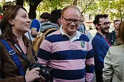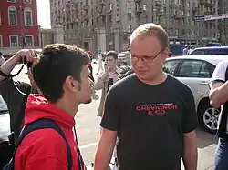 He opposed the Russian invasion of Ukraine in 2022.[31] Despite taking a strong anti-war stance and describing the actions of the Russian authorities as cannibalistic toward Ukraine and suicidal for Russia itself, he was included by Alexei Navalny's associates on a list of about 6,000 Russian "bribetakers and warmongers" who deserve to fall under international sanctions because of the Russian invasion of Ukraine. Kashin himself linked his inclusion on the list to the fact that he "has repeatedly criticized people who are now speaking on behalf of Navalny."[32][33][34][35]