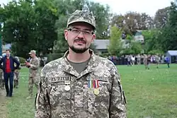 From April 2022, he was an officer of the Azov-Kyiv Special Forces, and from September an officer of the 3rd Assault Brigade, head of the humanitarian training and information support group of the staff psychological support department. He was also the head of the expert group on de-Russification in Kyiv.[5]