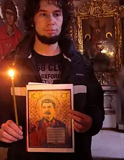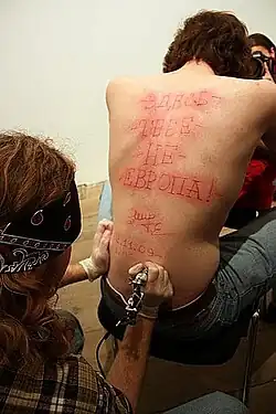 After his release from the pre-trial detention center, Oleksandr Volodarsky held a number of other artistic and political performances, which were covered by the blogosphere and the media. Special mention should be made of "Censorship of Audiences" at the presentation of Oles Ulyanenko's book "The Woman of His Dreams"[8] and the action "Orthodoxy or Law",[9] held in solidarity with victims of clerical censorship. At the end of September, as part of the Judicial Experiment exhibition on criminal cases against activists, Volodarsky asked for a scar with the words "This is not Europe for you" - words that the investigator said during his first interrogation.[10] The action "Consecration of the Icon of Stalin" in the Kyiv Pechersk Lavra, which was conducted by Volodarsky as part of the situationist group AKT (UOC officially denied the fact of "consecration"[11]). After the detention of members of the art group "War", Volodarsky initiated an action of solidarity with the arrested artists in Kyiv.[12]