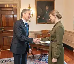 On 19 July 2022, Zelenska started her visit to the United States.[52] On the first day of the visit, Zelenska met with the US Secretary of State Antony Blinken, and Samantha Power, the Administrator of the United States Agency for International Development. On the second day of the visit, she held a meeting with the first lady of the United States, Jill Biden, at the White House.[53] Zelenska was also met on the porch of the White House by US President Joe Biden and Vice President Kamala Harris.[54]