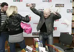 On 22 March 2009 he had a cake thrown at him by a FEMEN activist who declared his only fiction book sexist. Oles Buzina was rated 4th in the "Homophobe of the Year - 2011" list by the Ukrainian gay forum.[14]