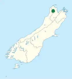 | Distribution of Oligosoma kahurangi on a map of the South Island Known native range