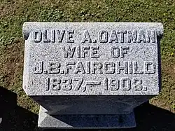 Her brother Lorenzo died on October 8, 1901. She outlived him by fewer than 2 years. Olive Oatman Fairchild died of a heart attack on March 20, 1903, at the age of 65.[27] She is buried at the West Hill Cemetery in Sherman, Texas.[28]