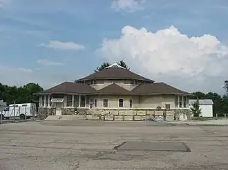 The new building was completed in 1908, and all the students were moved to it.[2][3][4] This structure, designed in the Craftsman style by architect Charles Insco Williams, was the first to be named Olive Branch High School, although it also still housed the lower grades of sub-district 3.[1] Known locally as the "little round school house", "little round building" or "little round O.B.", this building had a unique circular design with four classrooms that pointed inward to face a central cafeteria and gymnasium.[5] The building was destroyed when a boiler in the basement caught fire on November 10, 1913.[1][2][3][4] Classes were held in a barn until a replacement building was finished in December 1914, at a cost of just under $15,000, for which $7,000 in bonds were issued earlier that year.[1][2] Built on the same foundation, it was identical to the original building, but had doors added to each classroom so students could easily exit the building in case of fire.[3]