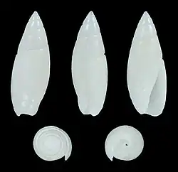 Olivella nivea, the snowy dwarf olive, is a species of small sea snail, marine gastropod mollusk in the subfamily Olivellinae, in the family Olividae, the olives. Species in the genus Olivella are commonly called dwarf olives.[1]