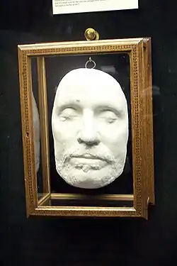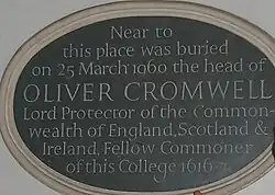 Cromwell's head remained there until at least 1684.[3] Although no firm evidence has been established for the head's whereabouts from 1684 to 1710,[4] tradition says that on a stormy night in the late 1680s, it was blown off from the top of Westminster Hall, thrown to the ground, and picked up by a sentry who carried it home.[4][5][b] After its disappearance from Westminster, it was in the hands of various private collectors and museums until 25 March 1960, when it was buried at Sidney Sussex College in Cambridge, Cromwell's alma mater.