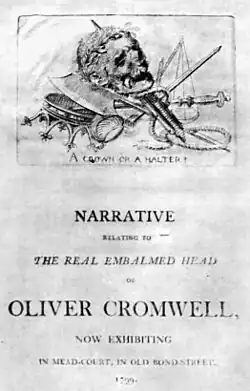 Cox sold the head in 1799 to a trio of speculators, the Hughes brothers, for £230 (about UK £30,000 in 2020 money).[30] Interested in starting their own display in Bond Street, the brothers acquired the head as part of other Cromwell-related items. Thousands of posters were produced for the event, but the exhibit was marred by doubtful provenance. The Hughes brothers and their publicist, John Cranch, wrote to Cox to ask about the gaps in the journey, but Cox was evasive, leading to concerns that he had sold them a fake.[31] Indeed, Cranch could not come up with a documentary history of how the head came into their hands, so improvised a story that Cromwell's head was "the only instance of a head cut off and spiked that had before been embalmed; which is precisely the case with respect to the head in question".[32] Although Henry Ireton had also been embalmed before being beheaded, the story stuck, but it was in vain. The exhibition was a failure. The entrance fee was high (two shillings and sixpence, about the equivalent of £5[20]) and rumours that the head was a fake were prevalent.[22]