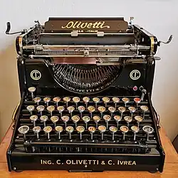 Until the mid-1960s, the Olivetti typewriters were fully mechanical. Introduced at the World's Fair in Turin in 1911, the first Olivetti typewriter, the M1, was made of about 3000 hand made parts and weighed 17 kg.[1] It was the first Italian typewriter and had a keyboard of 42 keys corresponding to 84 signs,[2] 33-cm paper roll allowing for 110 characters and featured two-colored ribbon, automatic reverse direction, and return key.[3] Heavy and massive, it was intended for professional use in offices.