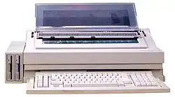 The ETV 2700 is the low cost successor of ETV 260, based on the ET 2000 series printer mechanics.[27] The machine is a fully integrated, NEC V40-based PC, with the electronics to control the printer on one small footprint mainboard. Even the keyboard is directly attached to the machine. The system runs MS-DOS and the SWP word processor software which is document compatible to ETV 260 / 3000 SWP. The external black and white CGA compatible can be installed on a pivotable arm. As mass storage there could be one 720 kB MS-DOS compatible floppy drive, or two of them, or one of them plus 20 MB XTA interface based harddisk.